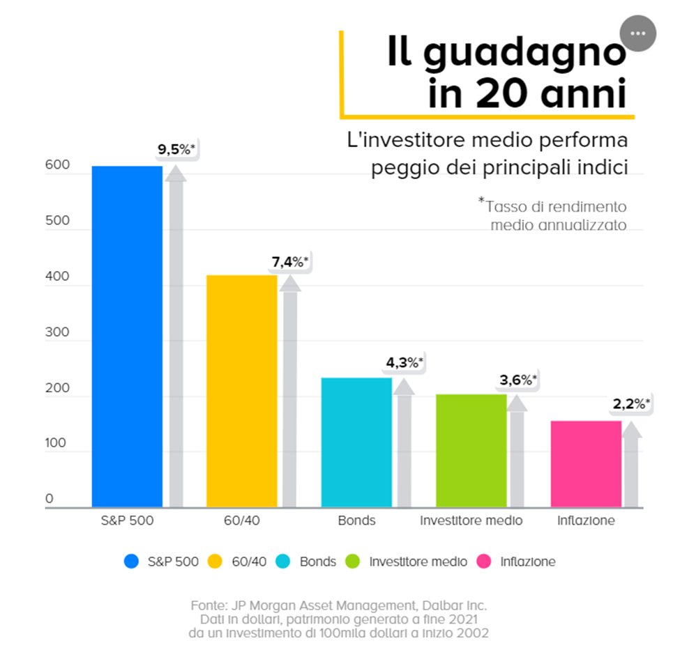 Guarda questo grafico. L'investitore medio statisticamente ottiene performance peggiori dei mercati finanziari. Perché?